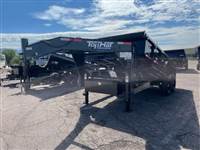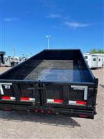 Top Hat 7 X 14 gooseneck dump trailer with 14k GVW . Trailer is 7' wide, 14' long, steel deck, adjustable Bull-Dog Hitch, lockable pump and battery box, spare tire mount, stake pockets, D- Rings, heavy duty diamond plated fenders, double back doors, spreader gate, sliding ramps, 2-7000# axles, brakes on both axles, 16" tires, and 8 bolt hubs.