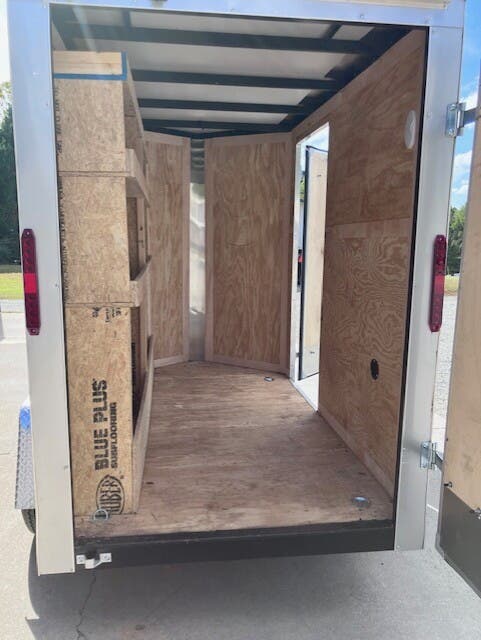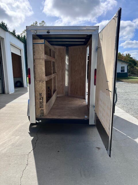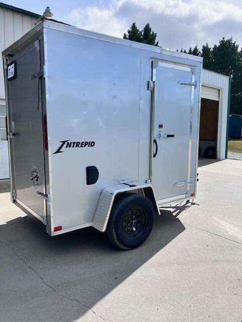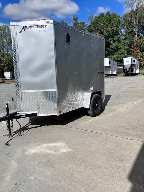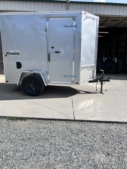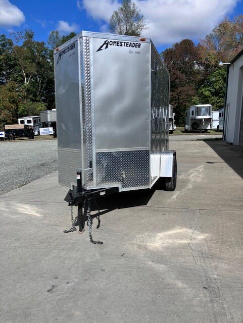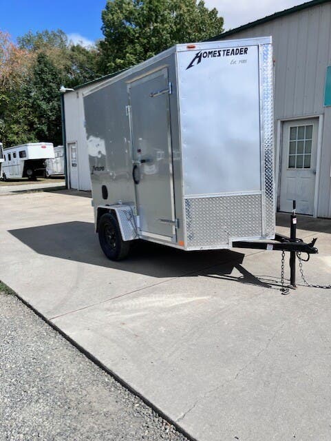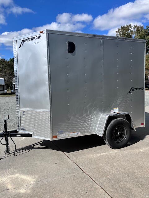 Previously Titled 2026 Homesteader Intrepid, 5x8, 6'6" Tall, SA, Single Rear Door, 32" Side Entry Door, Heavy Duty All Steel Boxed Frame, Tubular Steel Wall And Roof Structure, Under Coated Frame, Cross Members 24" OC, 2' V-Nose, Aluminum Exterior With Baked Enamel Finish, One Piece Aluminum Roof, LED Lights, 3/4" Exterior Grade Plywood Floor, 3/8" Plywood Interior Wall Liner, 32" Side Entry Door, Interior Dome Light, 15" Trailer Rated Tires, GVWR 2990, Approx Empty Wgt 1128, Approx Carry Wgt 1862