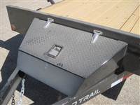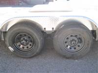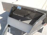 ) D-rings 4" welded on the bed & stake pockets on the sides, toolbox on the tongue with locking lid, spare tire mount, rear load support jacks & powder coated Black with primer.