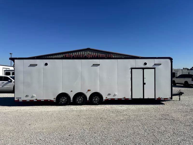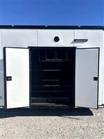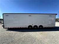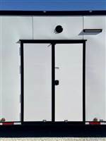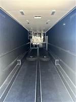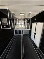 Cargo Area - Rubber composite no slip floor, 3 full length E-track strips recessed in floor, lined and insulated walls and ceiling, 6 wall recessed E-track strips, carpet walls, cable assisted rear ramp w/ 4' flip out extension, dove tail, 30 amp service, 4 interior 110 AC outlets, 2 crank up roof vents, White & blue interior LED lights, winch ready, radio, 4 interior speakers, 42" US general tool box, cabinets, wardrobe closet, side access w/ two doors.