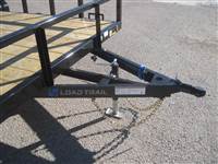 2026 Load Trail 83x14 single axle utility trailer with 5200# axle, 4" channel tongue, 4" channel frame, EZ lube hubs, ST225/75R15 LRD radial tires on 6-hole black wheels, 2" Bulldog clamp-style coupler, treated wood floor 12' flat plus 2' dovetail, diamond plate fenders, 36" tubing ramp gate with spring assist