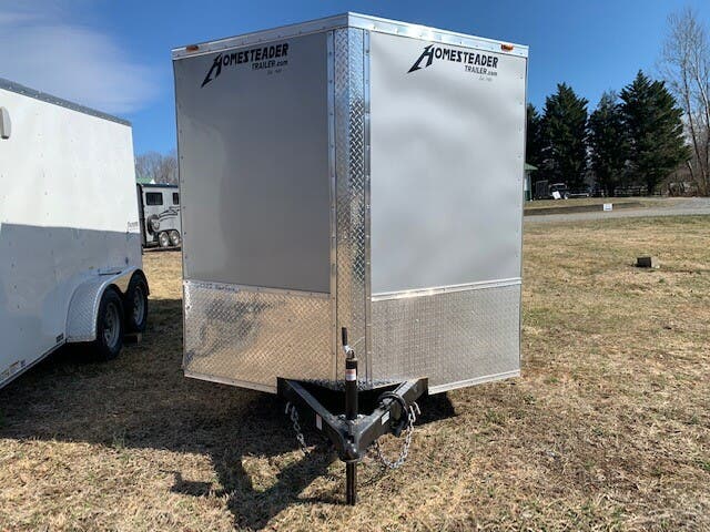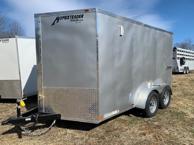2026 Homesteader Intrepid 7x12, TA, 6'6" Tall, Silver, 16" OC Floor Crossmembers, Stud Walls, and Roof, 3/4" Exterior Grade Plywood Floor, 3/8" Plywood Interior Wall Liner, 32" Side Entry Door, (2) LED Interior Lights, LED Loading Light, Rear Ramp w/6" Extension Flap, 15" Tires, GVWR 7000, Empty 1942, Carry 5058