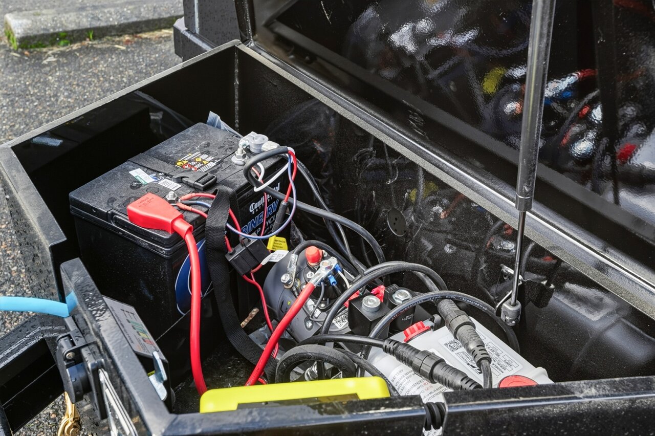) Doors: Double Rear Doors Fenders: 9" x 72" Diamond Plate, Double Square Broke Lighting: Recessed, Grommet-Mounted LED Battery: 12V Deep Cycle with Onboard Charger Jack: 7,000# or 8,000# Top Wind Drop Leg Key Features Durable Construction: Heavier frame and floor than lighter-duty models. Convenient Loading: Double rear gates and optional ramps. Secure Storage: Lockable pump and battery box. Enhanced Control: Stake pockets and D-rings for tie-downs. Easy Maintenance: Self-adjusting electric brakes and quick-lube hubs. 90SR - Big Tex Trailers Features & Options ; 6x2 Rectangular Tubing ILO 6" channel · 3" Channel on 16" Centers · 12 Gauge Smooth Steel · 9” x 72” 14 Ga. D...
