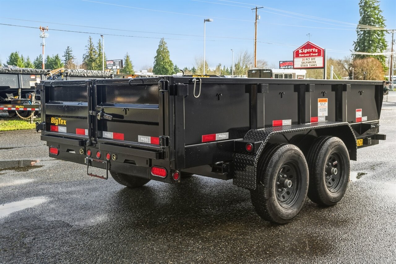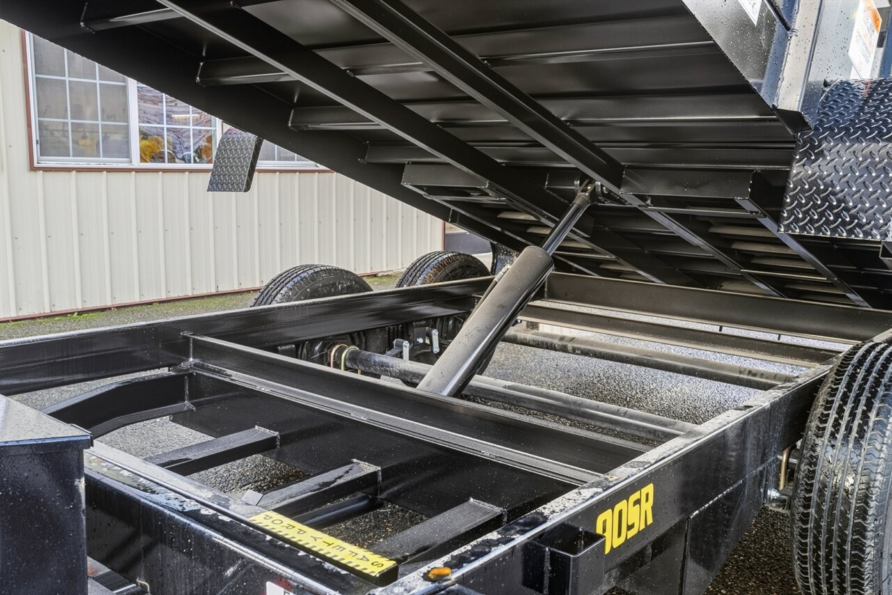 The Big Tex 90SR is a heavy-duty, tandem axle dump trailer with a 9,990 lb GVWR, featuring a 12-gauge steel floor/sides, 6x2" tubing frame, single-ram hydraulic lift, 20" side height, double rear gates, and optional ramps, suitable for hauling materials like dirt, gravel, or small tractors, with standard electric brakes, LED lights, and a 12V battery system. Key Specifications