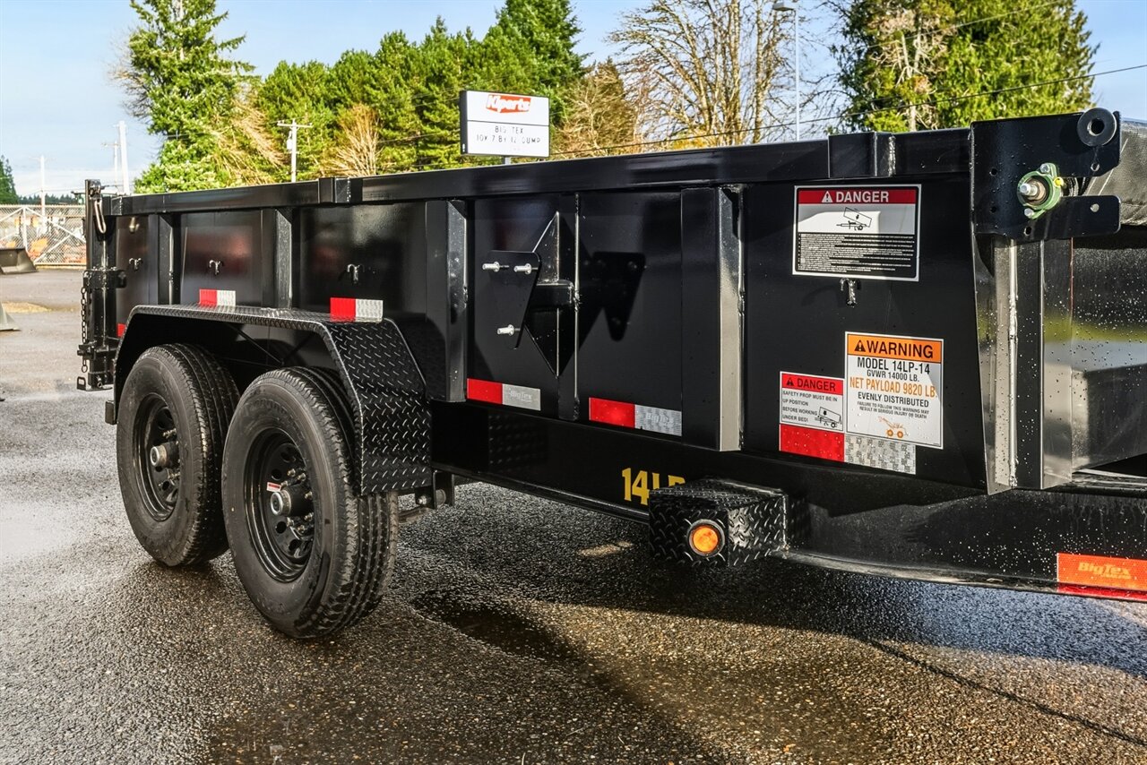 The Big Tex 14LP is a heavy-duty, low-profile dump trailer with a 14,000 lbs GVWR, featuring tandem 7,000# axles, an 8" I-beam frame, 10 gauge steel floor, and a power-up/down scissor hoist, often coming with 16' or 14' deck lengths, 83" width, combo gate, and standard LED lighting with a tarp kit for versatile equipment hauling and material transport. Key Specifications GVWR
