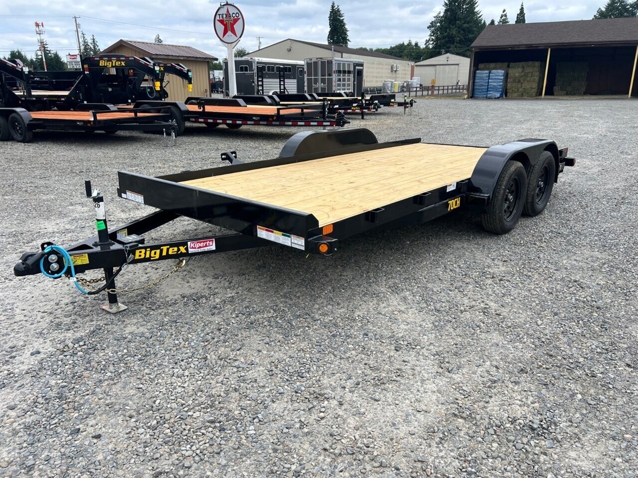 ) The 2026 Big Tex 70CH-20 Car Hauler is a rugged, versatile tandem-axle trailer designed to tackle your toughest transport jobs. Built with Big Tex’s reputation for strength and durability, this durable 7,000 lb GVWR car hauler makes moving vehicles, equipment, and utility cargo easier and more efficient. Heavy-Duty Build & Practical Design Constructed on a sturdy steel frame and featuring dual 3,500 lb axles, the 70CH-20 delivers dependable hauling performance with plenty of capacity for cars, ATVs, side-by-sides, small tractors, and more. The open-deck design with bolted teardrop fenders combines rugged functionality with easy maintenance and cleaning. Spacious & Accessible Deck With a 7' width and 20' deck length, this car hauler provides a generous flat surface that makes loading and securing vehicles or equipment hassle-free. A 2' dovetail and slide-in ramps help reduce loading angles for smoother, safer access when pulling vehicles aboard. Designed for Everyday Use This trailer is engineered for real-world duty with features like: Slide-in loading ramps for effortless loading/unloading. Removable teardrop fenders for easier ramp use and maintenance. Stake pockets and front bump rail for flexible tie-downs and cargo security. LED lighting and sealed wiring for enhanced visibility and durability. Adjustable coupler and sturdy jack for secure towing and ease of hookup. Stable & Safe Towing Equipped with electric brakes and a solid suspension system, the 70CH-20 offers reliable stopping power and control when transporting heavier loads — giving you confidence on highways, backroads, and job sites alike. Versatile & Multi-Use Trailer The Big Tex 70CH-20 isn’t just for cars — it’s a workhorse for hauling: Vehicles and race cars Equipment, mowers, and tractors ATVs, UTVs, and utility gear Building materials and landscaping equipment Whether you’re a weekend warrior, contractor, or automotive enthusiast, this Big Tex car hauler delivers strength, reliability, and everyday usability you can count on. Empty weight: 2,060lbs Carrying capacity: 4,940lbs