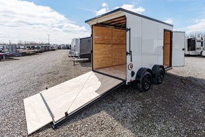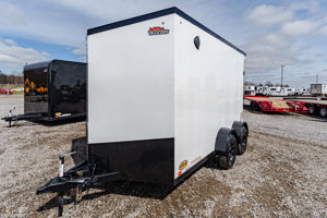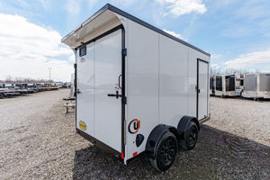 This compact yet capable 7’ x 12’ enclosed cargo trailer is perfect for hauling equipment, small vehicles, or jobsite gear. Built with a rugged tube frame, tandem torsion axles, and a sleek slant V-nose, it delivers smooth towing and dependable performance. The Black Out Package gives it a sharp, aggressive look with blacked-out trim and accents.